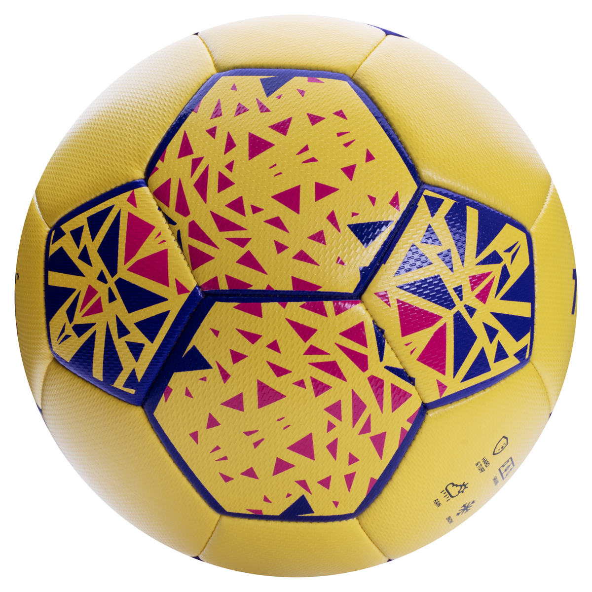 Матовая, структурированная, мягкая синтетическая кожа (термополиуретан, состоящий из полиуретановой пены толщиной 5 мм, и защитной полиуретановой пленки толщиной 0,15 мм), 2 подкладочных слоя из пены и синтетической ткани, резиновая камера, армированная 2 нитями нейлона и 1 нитью полиэстера. Машинная сшивка, 32 панели. Размер 5. Подходит для игры на любых поверхностях, но особенно рекомендуется для натуральных и искусственных газонов, полей с синтетическим покрытием различной степени жесткости. Подходит для игры в любых погодных условиях (при соблюдении условий эксплуатации и ухода). Рекомендуется для игр и тренировок в учебных учреждениях, для комплектации бюджетных госзаказов, а также для любительской игры.
